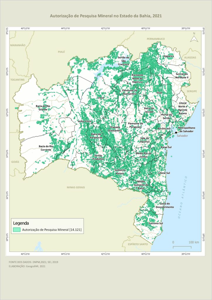 Um mapeamento elaborado pelo Grupo de estudos Geografar UFBA (Universidade Federal da Bahia), publicado em setembro de 2021, revela a extensão dos pedidos e concessões de pesquisas para mineração. As autorizações estão representadas no mapa pelas manchas verdes e avançam por todo o estado da Bahia. A análise dos dados aponta para uma padronização normativa que desencadeia e propaga os conflitos.
