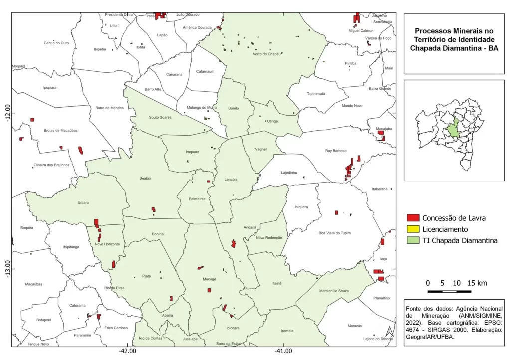 Um mapa desenvolvido pelo Grupo de estudos Geografar (UFBA) com enfoque na Chapada Diamantina aponta a presença de ações de mineração em mais de uma dezena de municípios. Os pontos em vermelho sinalizados no mapa apresentam processos minerários que já estão em lavra (extração) ou seja, com autorização para explorar a área. Já os pontos em amarelo, que não estão aparecendo no mapa de forma detalhada, apresentam os municípios que estão em fase de licenciamento, para então solicitarem a concessão de lavras. Atualmente somam-se 1.439 processos de solicitação de autorização para extração. O estudo ainda identifica conflitos específicos em Abaíra, Iramaia, Lençóis, Morro do Chapéu, Seabra, Piatã e Novo Horizonte. Portanto, esses números de concessões irão triplicar em curto espaço de tempo (fonte: Geografar com dados ANM, 2021; CBPM, 2021).